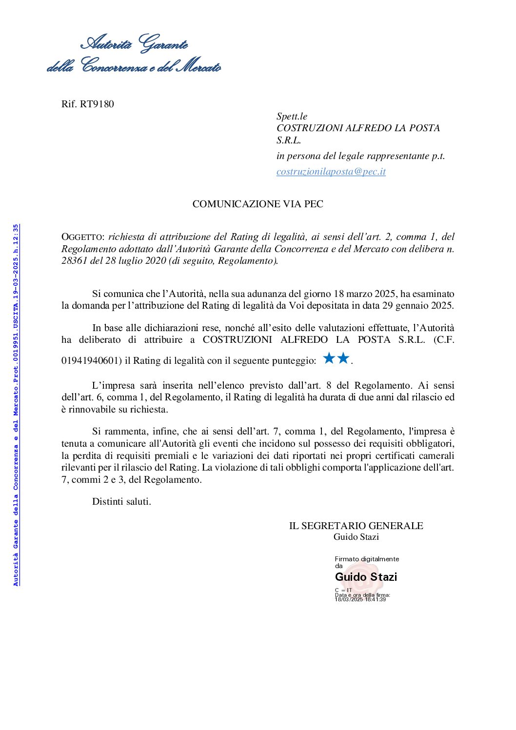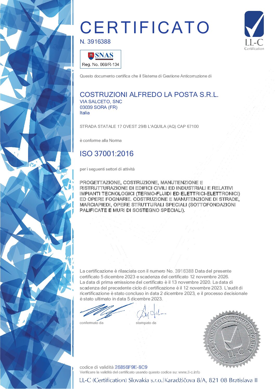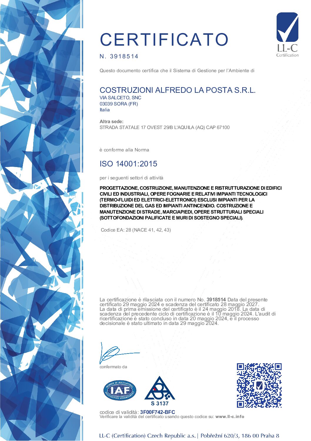 Costruzioni Alfredo La Posta S.r.l. è riconosciuta come Impresa Rosa dalla Regione Lazio, grazie alla significativa presenza femminile nella direzione e nella gestione aziendale.